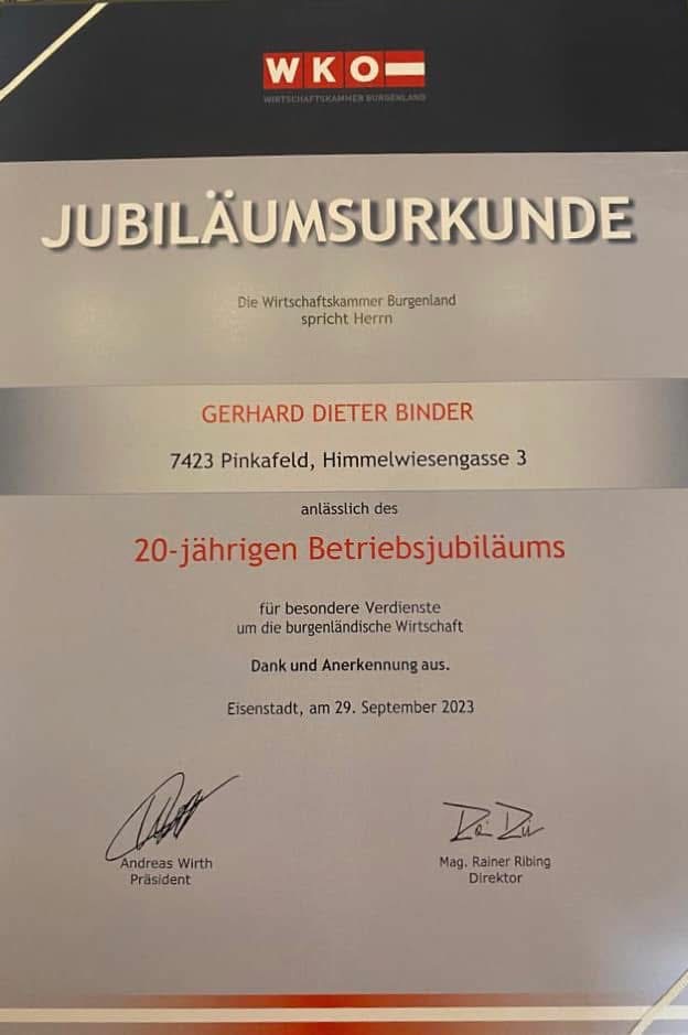 WKO WIRTSCHAFTSKAMMER BURGENLAND 20-jähriges Betriebsjubiläum